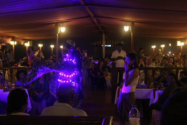 After few minutes, I saw a guy wearing a very colorful dress. I felt excited. I told them, "hey, maybe there will be a show? maybe he will be dancing?" And yeah I was right! They announced that we would be all standing and go on the second floor of the boat because there will be a show. Hmmm that sounds better!